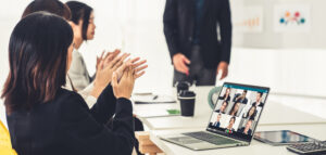 Business people in video call meeting proficiently discuss business plan