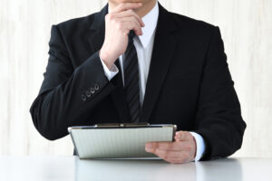 資料を見て考えるスーツを着た男性